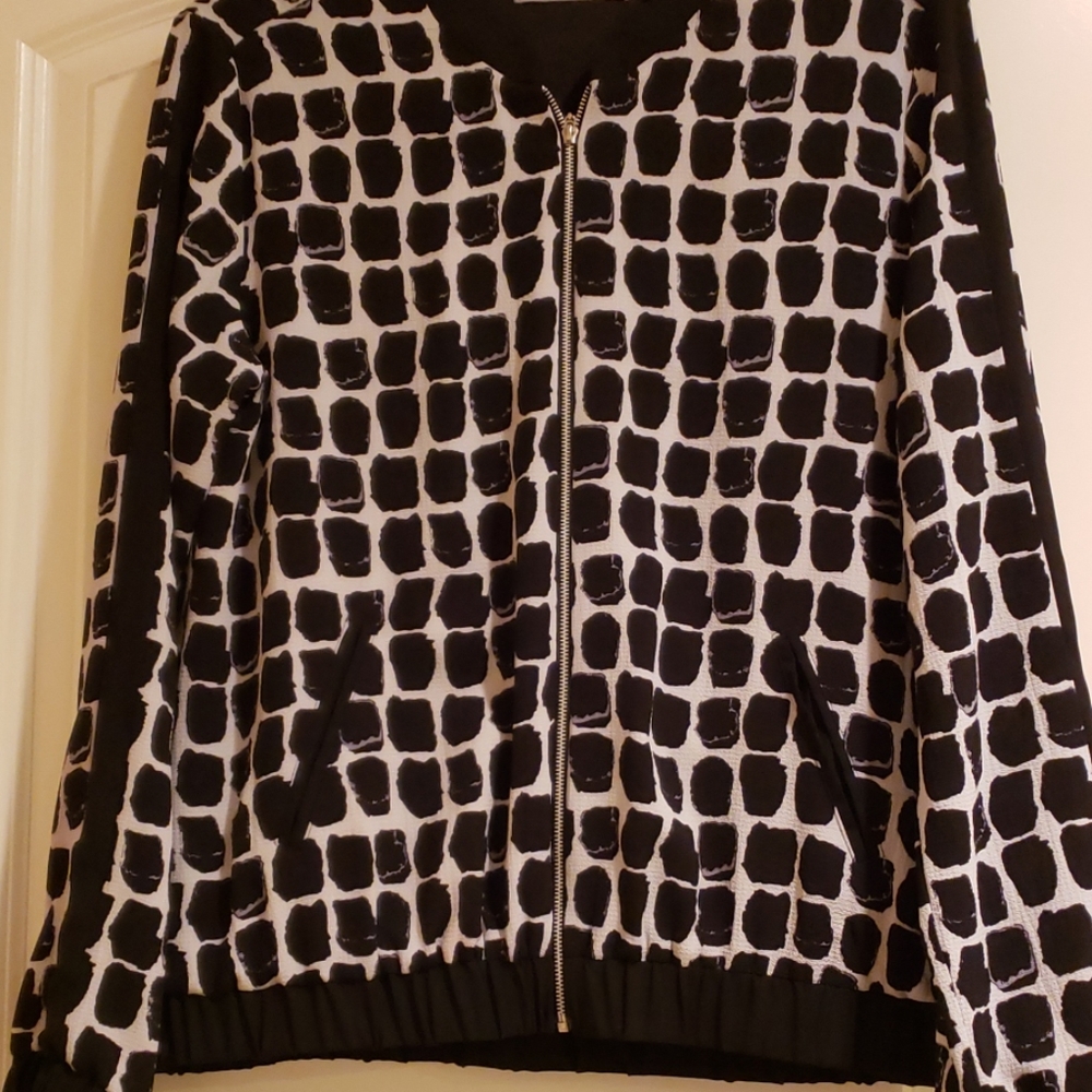 Black and white vallerie stevens jacket that zips in front with cute pattern. Can ne dressed up or down.