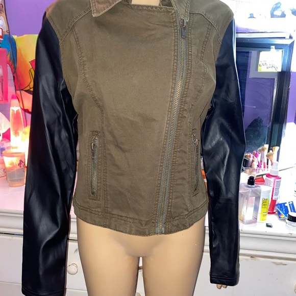 Really cool jacket with faux leather arms, never worn, super perfect for a night out or a dinner! Very comfortable it’s a large but does run a little small