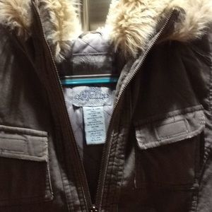 Grey corduroy with fur collar back collar zipper so you can open up hood