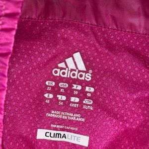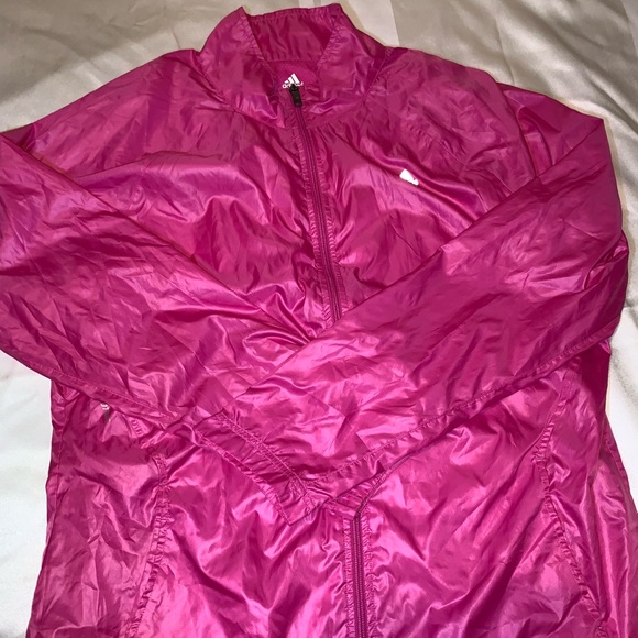 Adidas windbreaker jacket. Has a cinch-able waist. Runs a little bigger. Cute when paired with leggings and sweatshirts.