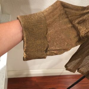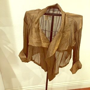 Waist length jacket, cuffed sleeves, over-sized collar. Can be worn open or use a brooch to keep it closed. It is a metallic copper color with gold shimmers, very elegant.