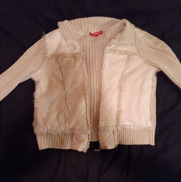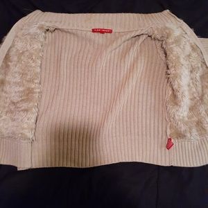 Camel zip up w faux fur on front. Very comfy.