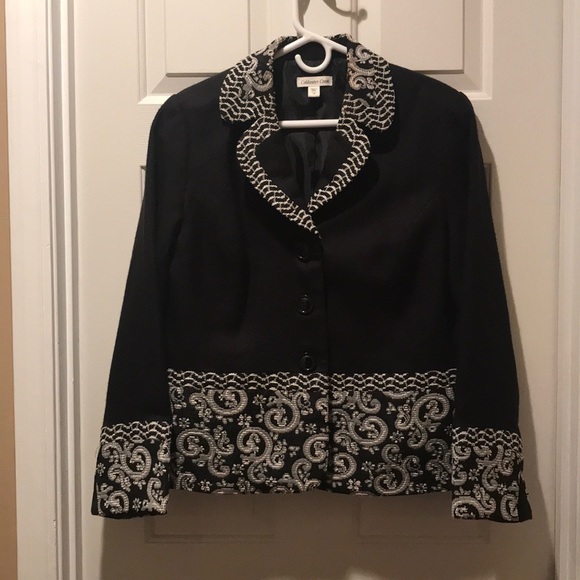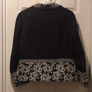 You will absolutely love this beautiful jacket/blazer. Black with white and gray design.