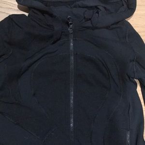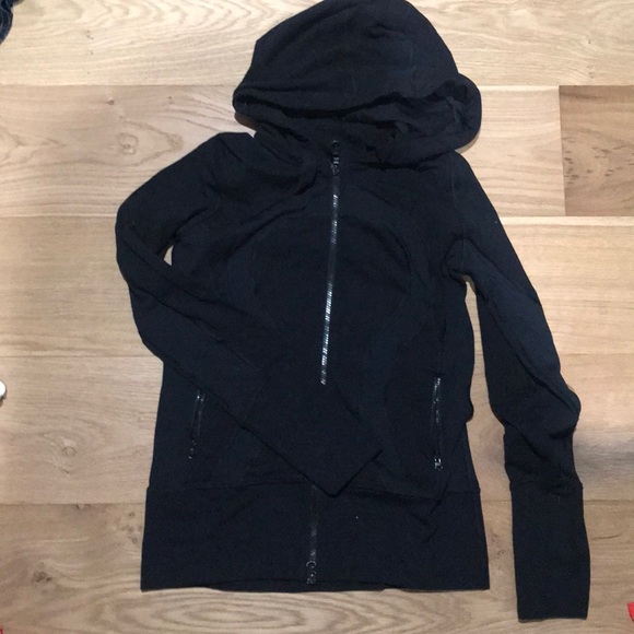 Black lululemon classic hooded jacket. Nylon material with lululemon symbol on the front. Back zipper, two front pockets and hood.