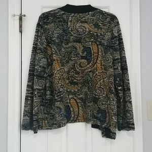 Polyester blend. Non wrinkle. Very flexible. Comfortable top. Washable. Great travel piece. Black, green, gold and metallic highlights.