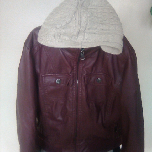 Ci Sono by cavilini- maroon leather- style jacket w beige mesh hoodie.