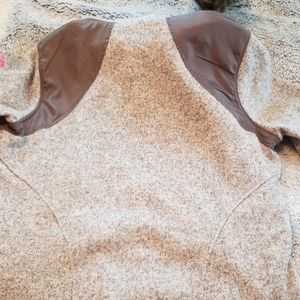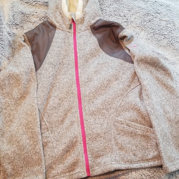 XL pink and grey zip up light but warm jacket. Hood is fuzzy on inside. Lightly used. Lightly fuzzy at cuffs.