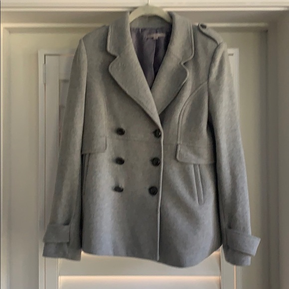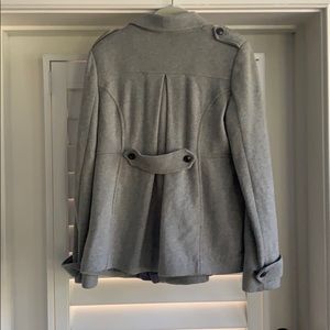 Super comfy lined jersey pea coat type jacket. Grey. Has pockets. Bottom up and has cute detail!