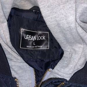 Blue and gray double zip up jacket with hoodie and button pockets
