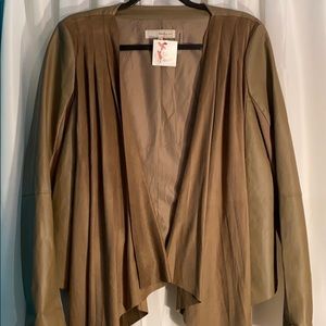 Cute jacket front is suede the arms have half leather half brown elastic nice tailored back front is longer than back