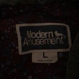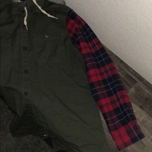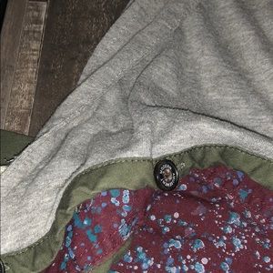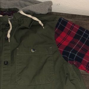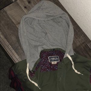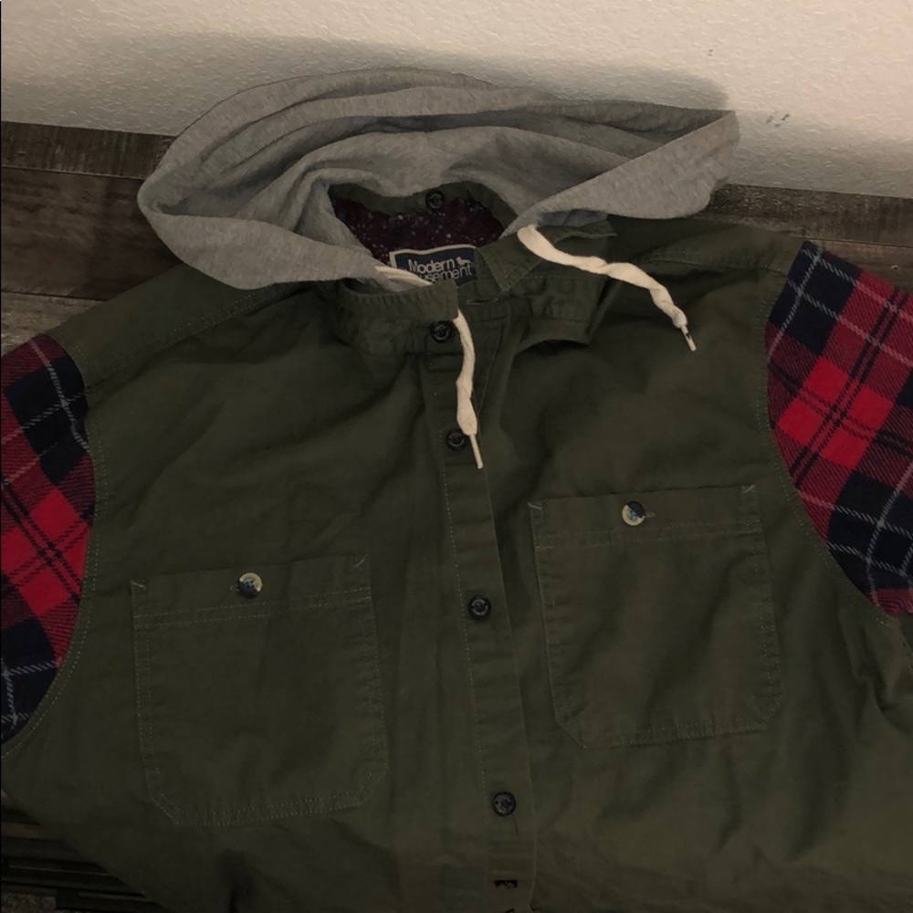 Super cute light weight jacket, arms are a thicker flannel and the middle is a thinner material, great condition, hood can detach