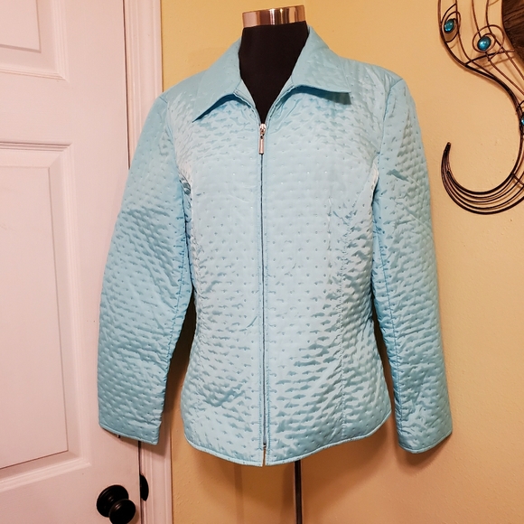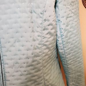 This is a light blue, lightweight jacket with a zipper front and zippers on the sleeves