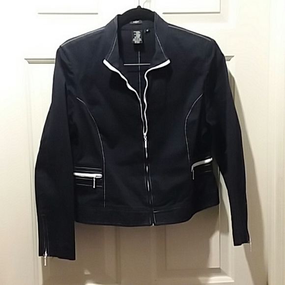 Casual navy blue cotton jacket. White stitching and zippers. 3% spandex for comfy fit! Only worn a few times, like new!