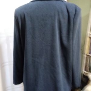 Teal unlined suede cloth jacket. It has notched collar and welt pockets.