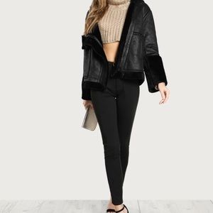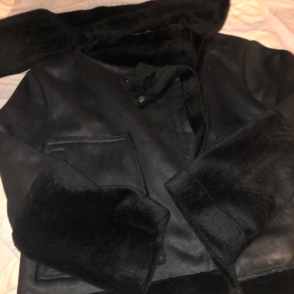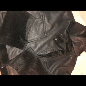 Faux suede material with faux fur lining around the sleeves. Comes with a scarf component that you can clip together