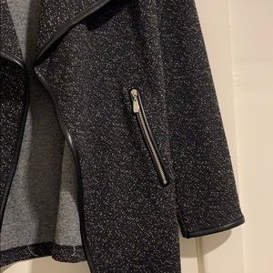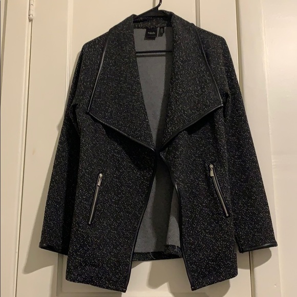 Black jacket with white dots and zipper pockets. No zipper or buttons