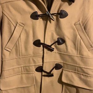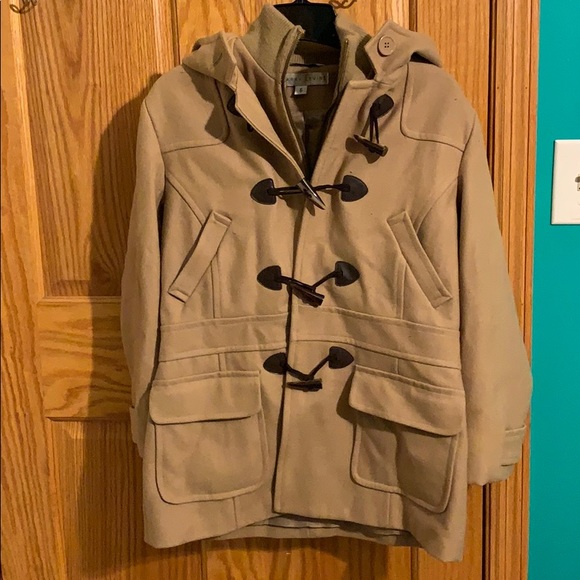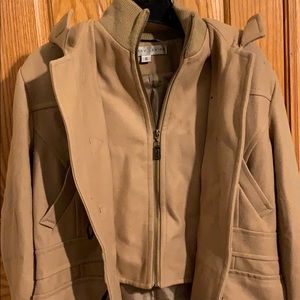Cream colored thick jacket. Hood and also zipper then closure. Four pockets
