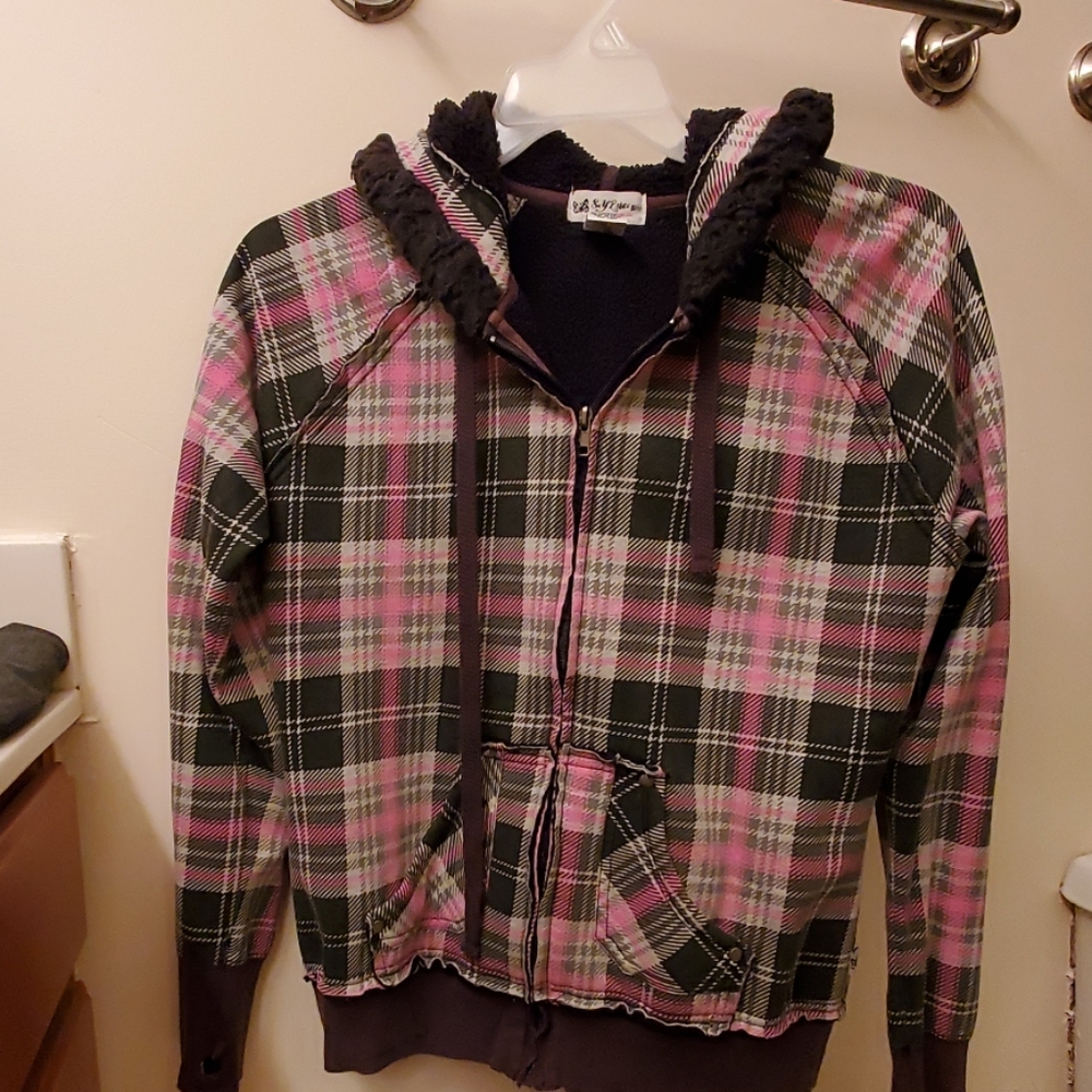 Pink, gray, and black plaid. Brown trim. Has thumb holes.