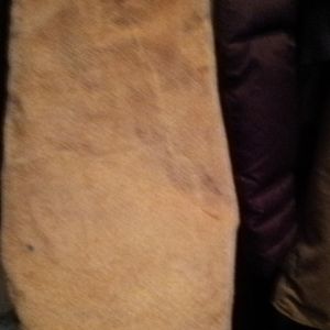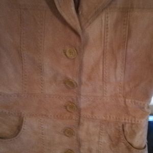 Genuine Leather which means cleaning is specialized fyi. Tan, in small. It has a few small dark stains on sleeve.