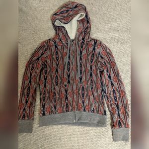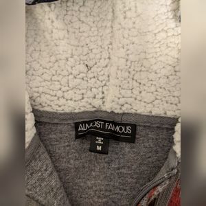 Zip up jacket, red blue and grey, really fuzzy
