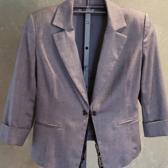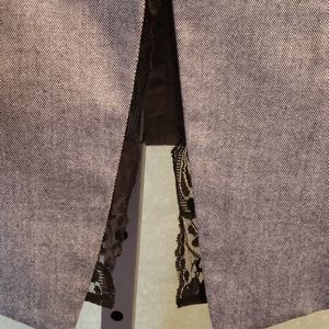 Lightweight washable tweed jacket. Ornamental closure with lace detail on lower front.
