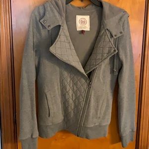 Grey hooded sweat material jacket. Super comfy& fits true to size. It’s not a loose jacket (like a hoodie), it sorta hugs your figure. Also, My favorite part is that it doesn’t zip straight up the center. Worn a handful of times but has a lot of love left.♥️