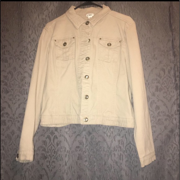 Cream colored jacket. Buttons have diamonds in them. Pocket on either side of the chest.