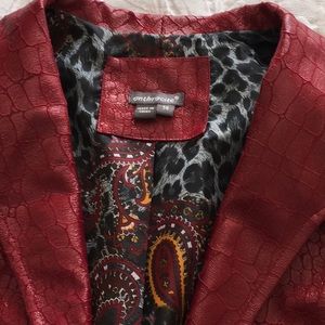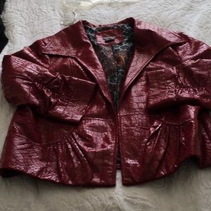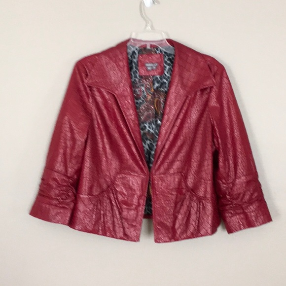 Red faux alligator leather jacket. 3/4 sleeve, front pockets, ruching detail on sleeves and pockets, beautiful paisley lining. No tags but never worn