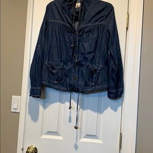 Lightweight jean jacket with drawstring collar and drawstring bottom snaps going up