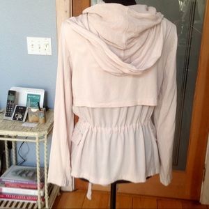 Unique styled jacket, soft cotton and linen, has two layers. The jacket itself is gathered at the waist with a string tie, front pockets, and a hood. The inner layer is soft, thin cotton that sports and additional hood. Light, airy stylish!