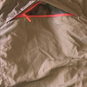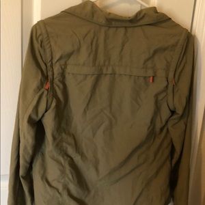 Women’s olive green travel jacket. Button front. Pockets zip and removable sleeves. Very light weight. No size label, fits size XS/S.
