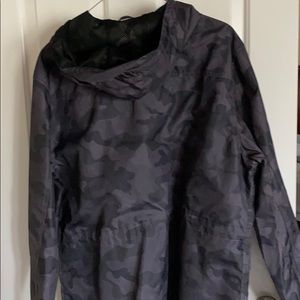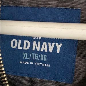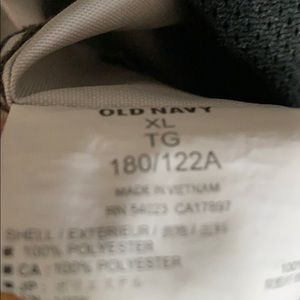 Old Navy button & zip down jacket with hood . Polyester. Great for rain.