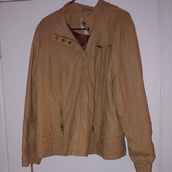 Pleather jacket has hardly been worn. Slight imperfections from being on plastic hanger for so long but is on inside of jacket.