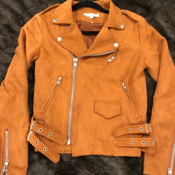 Burnt orange/camel orange type of color (looks more orange in pics). Stretchy material so you don’t feel restricted wearing it. Made of polyester & spandex. Outer jacket material feels like “suede.” Barely worn like new!