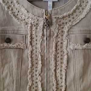 Diane Gilman tan denim jacket. Medium weight and unlined. Stretchy fabric with enough give to fit comfortably in style. No pockets.