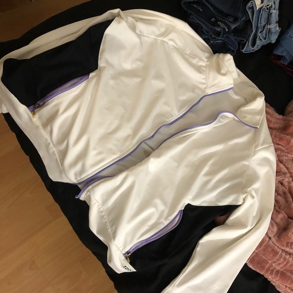 It’s white and in the sides it has black and purple! Material is thin so would be perfect for summer time!