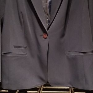 Classic blazer...60% rayon 20%polyester 5%spandex. Lining 100% polyester. One button closure 3 false pockets on front vented back. 3 buttons on each long sleeve.