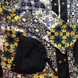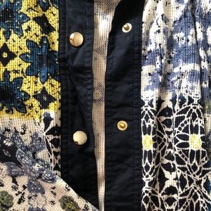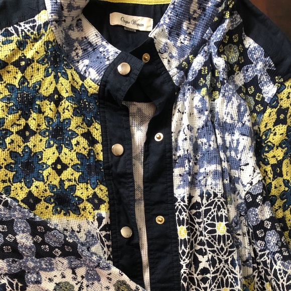 Beautiful cloth snap up jacket with solid blue pockets! Very classy and looks great with anything !