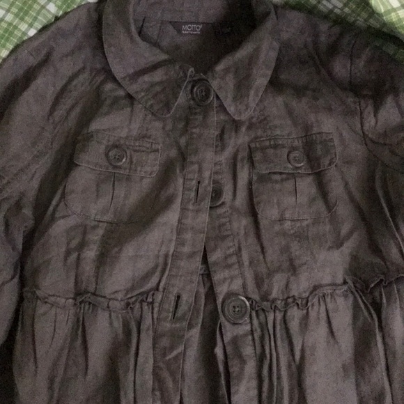 Very light weight jacket dark gray excellent condition flows out towards the bottom hundred percent linen inside land hundred percent call Esther excellent shape