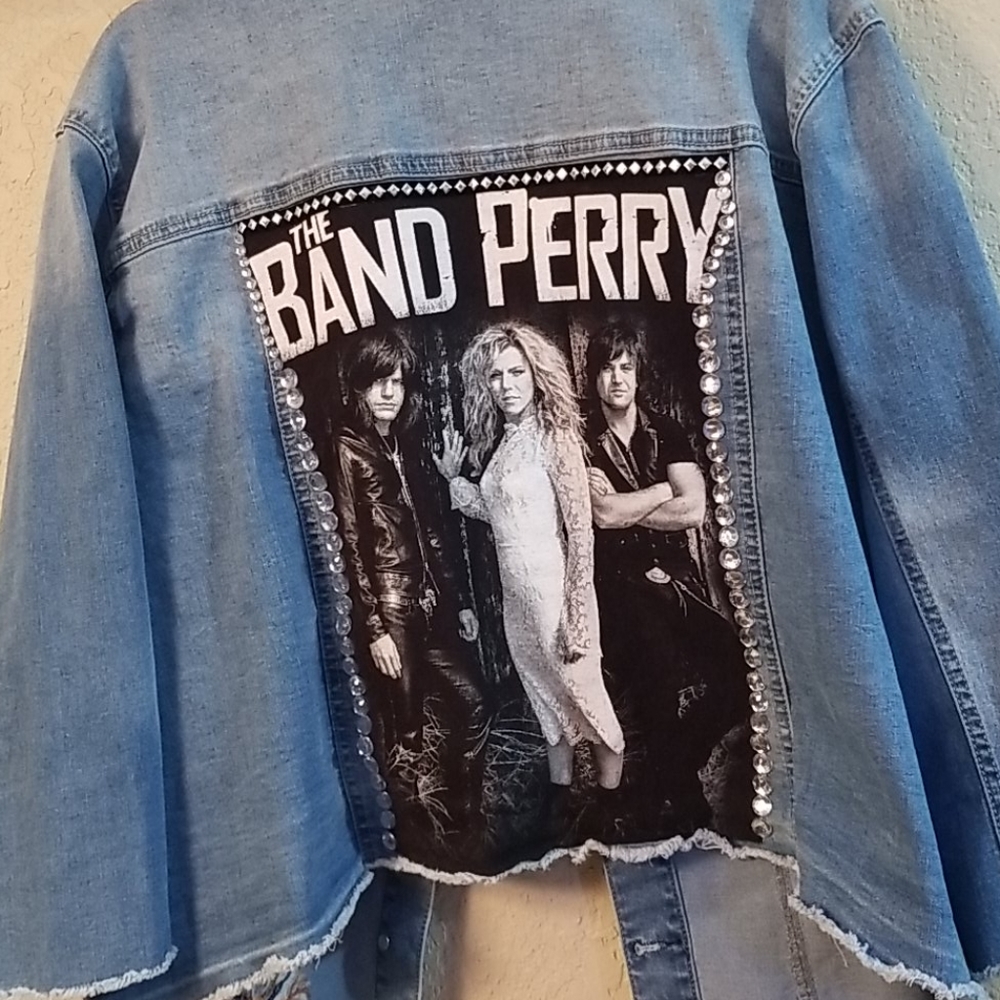 Plus size jacket(24 wide), freyed edges, 3/4 sleeves, stretchy, The Band Perry tee on back, rhinestone border and on front pockets, never worn, very cute