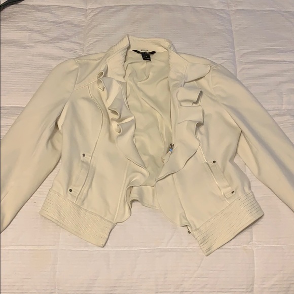Off white color. Ruffles in front. Zips with cute feather zipper that you can’t see in photo. good for business casual. Too big on me. Worn once.