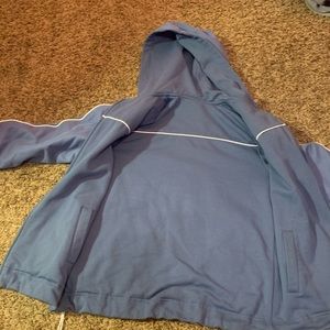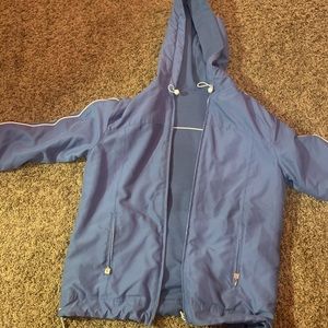 Light blue jacket with white lines. Reversible (able to switch sides and wear whichever side you want)