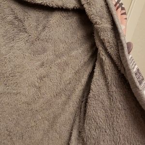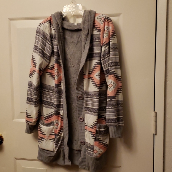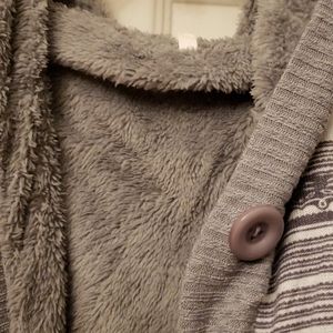 Gray and pink long jacket. Comes down over waist. Its fuzzy inside all the way through the sleeves! Been worn once! 😊
