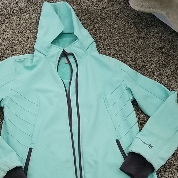 Light blue jacket with an attachable hood. Slighty dirty around the hand openings