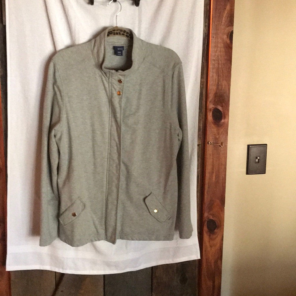 Grey jacket zips up and then snaps