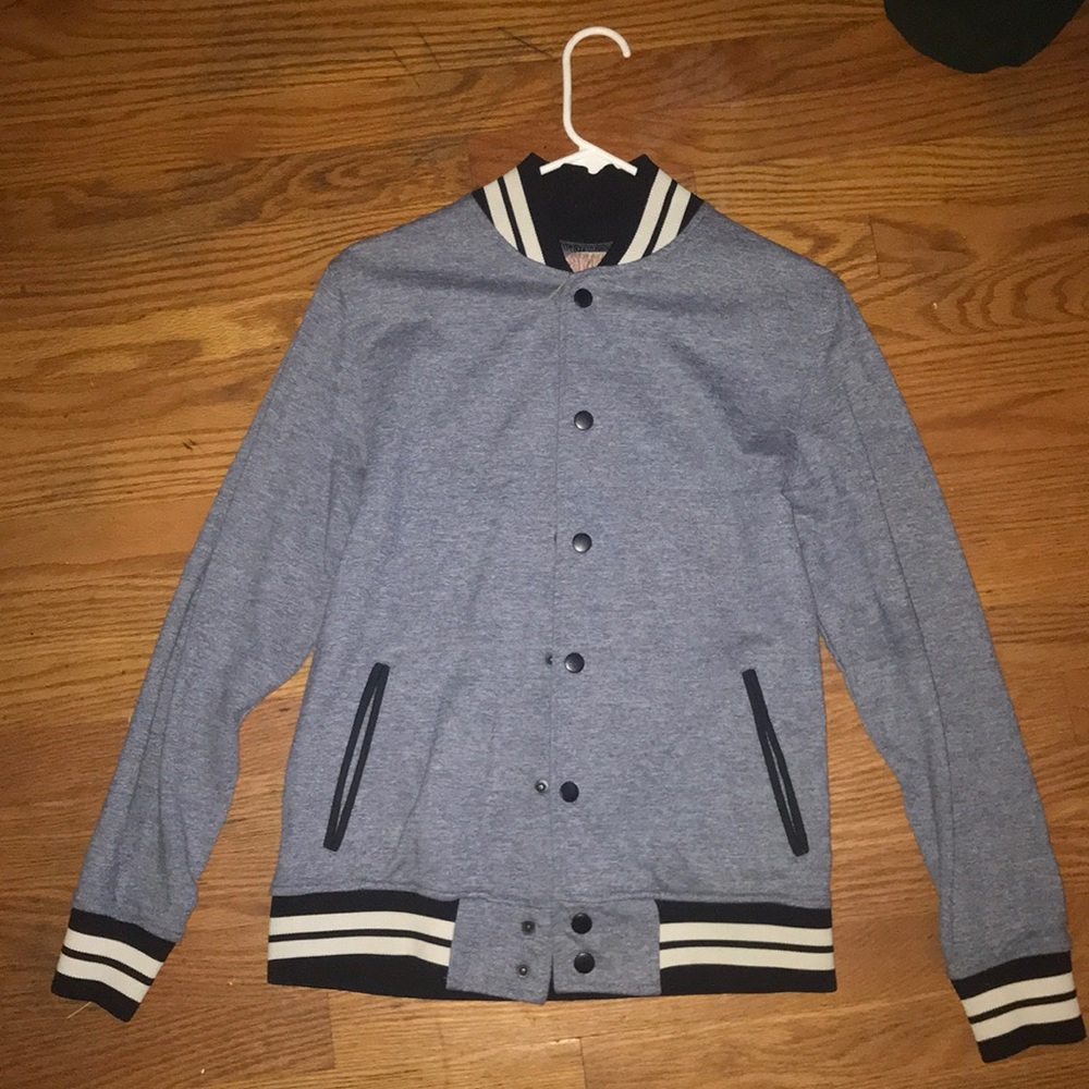 Grey button up jacket with white and black strips. Also has a soft cotton inside.