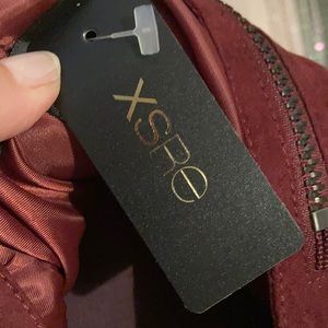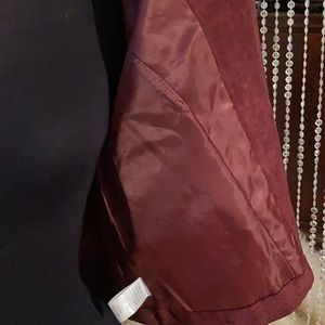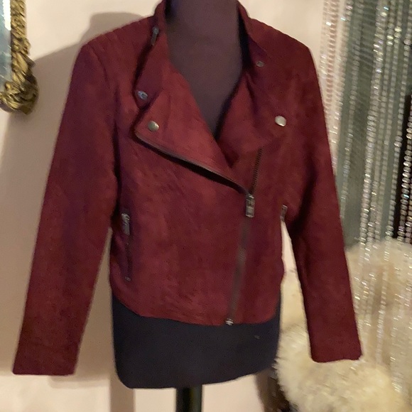 Burgundy faux suede jacket.. side zip pockets. Zipper around collar .. size large..fits like a med.
