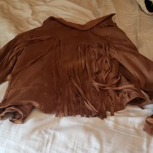 Tan jacket, zips in front, has fringe in back. super cute. worn once. sleeves have zippers. has front zip pockets.