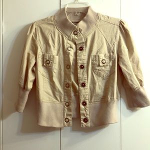 Khaki jacket with silver buttons, will go great with jeans or dress.