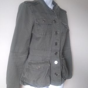 Unique green denim army-style jacket by Full Tilt. This✨ one has flair with tapered middle & brush metal buttons.